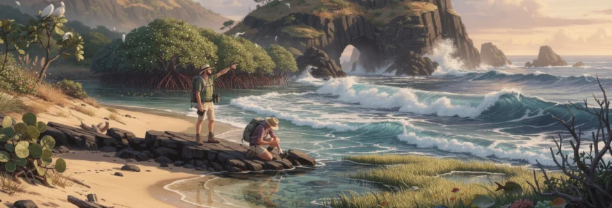 En arrière-plage et sur les falaises exposées plein est, la végétation littorale doit composer avec le sel, le vent et des sols souvent pauvres. C’est le royaume des espèces xérophiles comme le raisinier bord-de-mer (Coccoloba uvifera), reconnaissable à ses grappes de fruits comestibles, et le mancenillier (Hippomane mancinella), arbre toxique dont la sève peut provoquer de graves brûlures. Ce cortège végétal assure un rôle capital de fixation des dunes et de stabilisation des talus côtiers, un peu comme une armature végétale qui maintient le sable et les sols en place. Pour le randonneur, apprendre à identifier ces espèces n’est pas un simple exercice botanique : cela permet aussi d’éviter les risques liés au mancenillier, dont l’ombre accueillante peut se révéler trompeuse lors d’une averse tropicale.